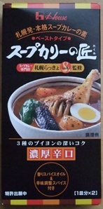 最近は、スーパーでもスープカレーの素というのか、カレールーみたいなものが売っていますね。3年ほど前から好きでよく食べているのが、ハウスの「スープカリーの匠」です。と言うか、3年ほど前に近所のスーパーで買えるのが、このスープカリーの匠ぐらいしかなかったのですが・・・。ただ、ほかに選択肢が無いから仕方なくということではなく、かなり美味しいと思います。それもそのはず、今まで気がつかなかったのですが、箱を見ると「札幌らっきょ監修」とデカデカと書いてあります。