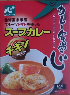 2013-07-04 2013年スープカレーの旅 番外編18(カレー食堂 心) スープカレー 「フルーツトマトを使った」とパッケージに書いてあるとおり、かなりトマトっぽい味がして美味しかったです。が、なんとなく調味料がいっぱい入っているっぽい食べなれた味だなぁと思ってパッケージの裏を見ると、やはりケチャップが入っていました。そうそう、ケチャップの味っぽいのでした。でもそれはそれで美味しかったです。しかし、この商品だけではありませんが、前にも書いたとおりスープカレーのレトルトパックは高いです。この商品は700円でした。 カレー食堂「心」のホームページ⇒こちら